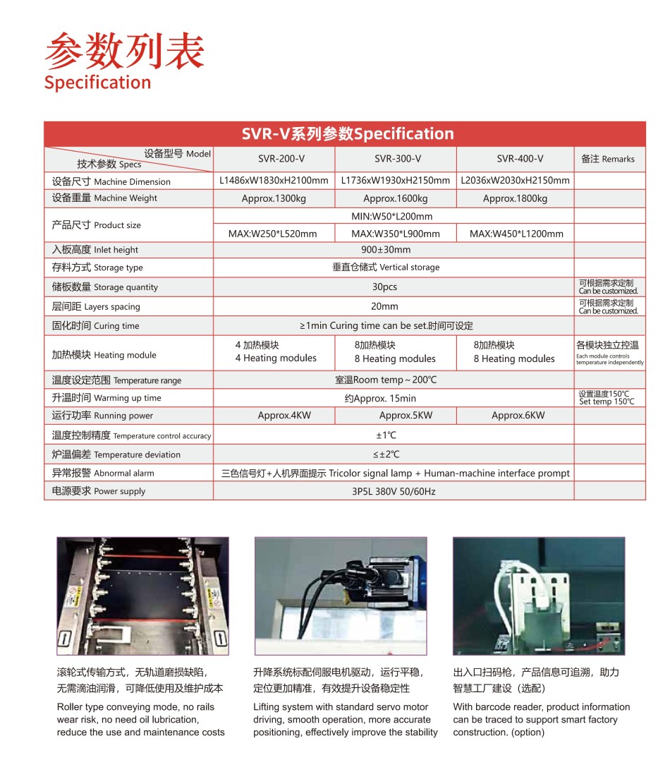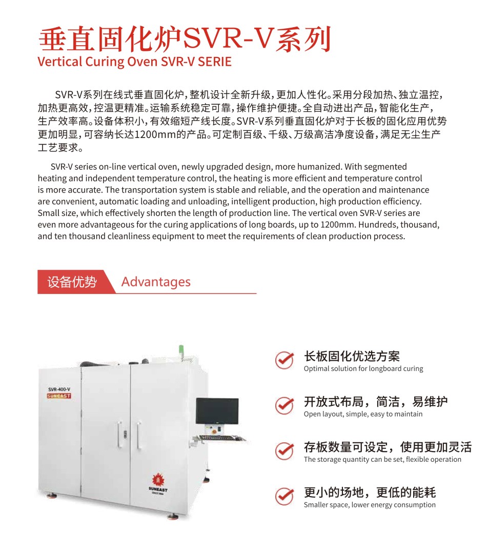 SVR-V系列在線式垂直固化爐,整機設計全新升級,更加人性化。采用分段加熱、獨立溫控,加熱更高效,控溫更精準。運輸系統穩定可靠,操作維護便捷。全自動進出產品,智能化生產,生產效率高。設備體積小,有效縮短產線長度。SVR-V系列垂直固化爐對于長板的固化應用優勢更加明顯,可容納長達1200mm的產品??啥ㄖ瓢偌墶⑶Ъ墶⑷f級高潔凈度設備,滿足無塵生產工藝要求。
